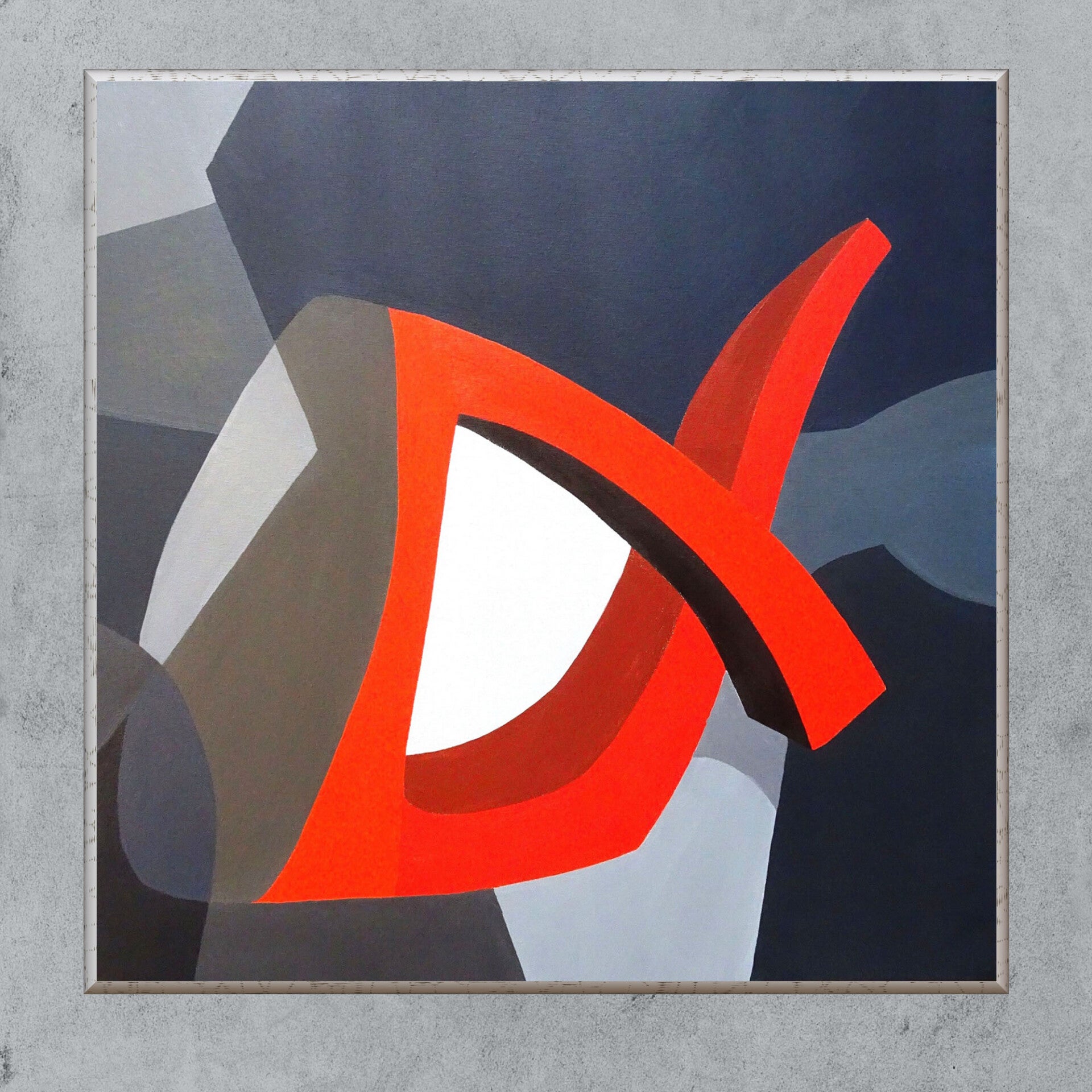 Modern mid century acrylic painting with geometric shapes and bold red and grey tones.