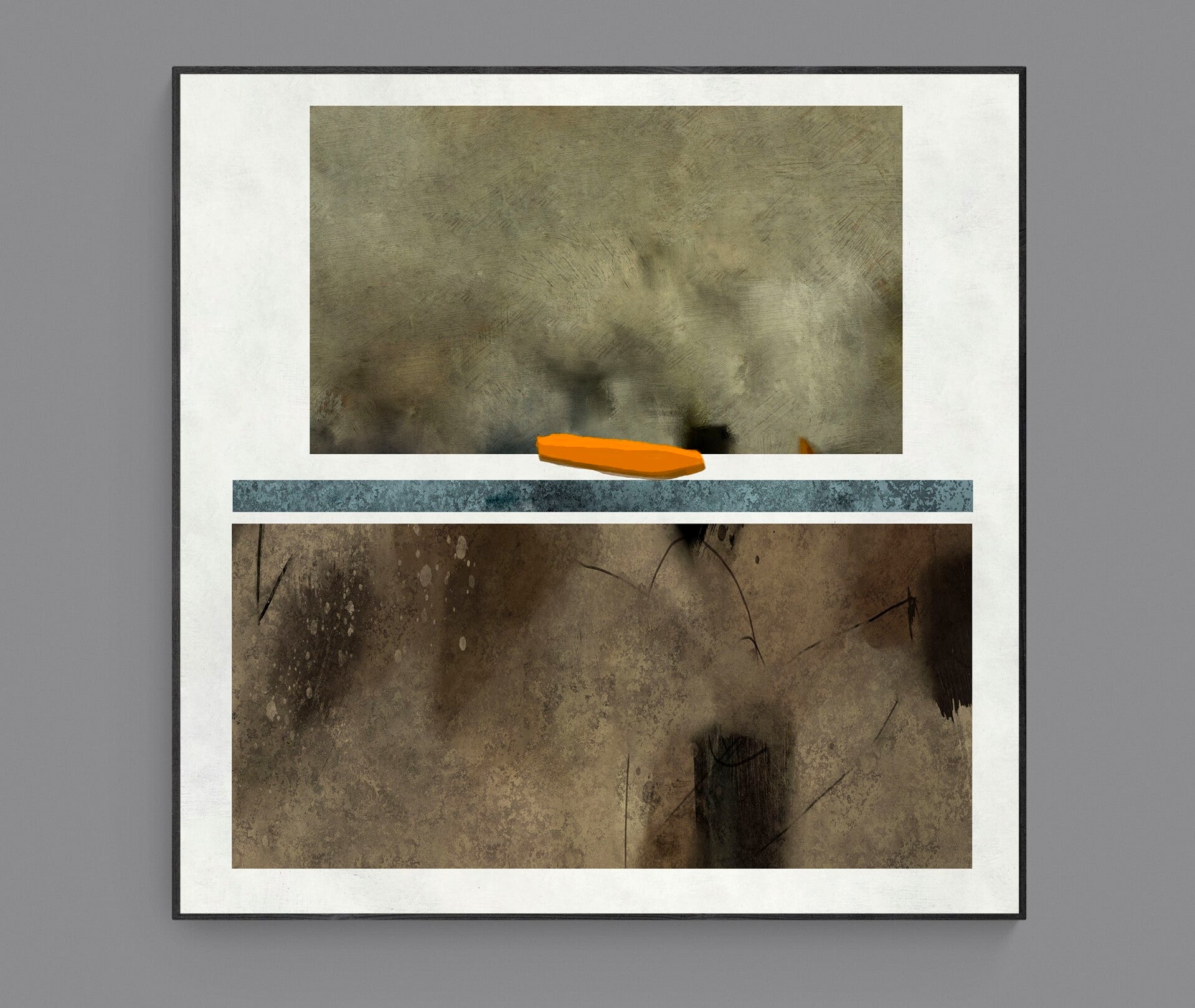 A single, bright orange shape sits atop the dividing line. Its smooth texture and geometric form stand out against the rough texture of the background.