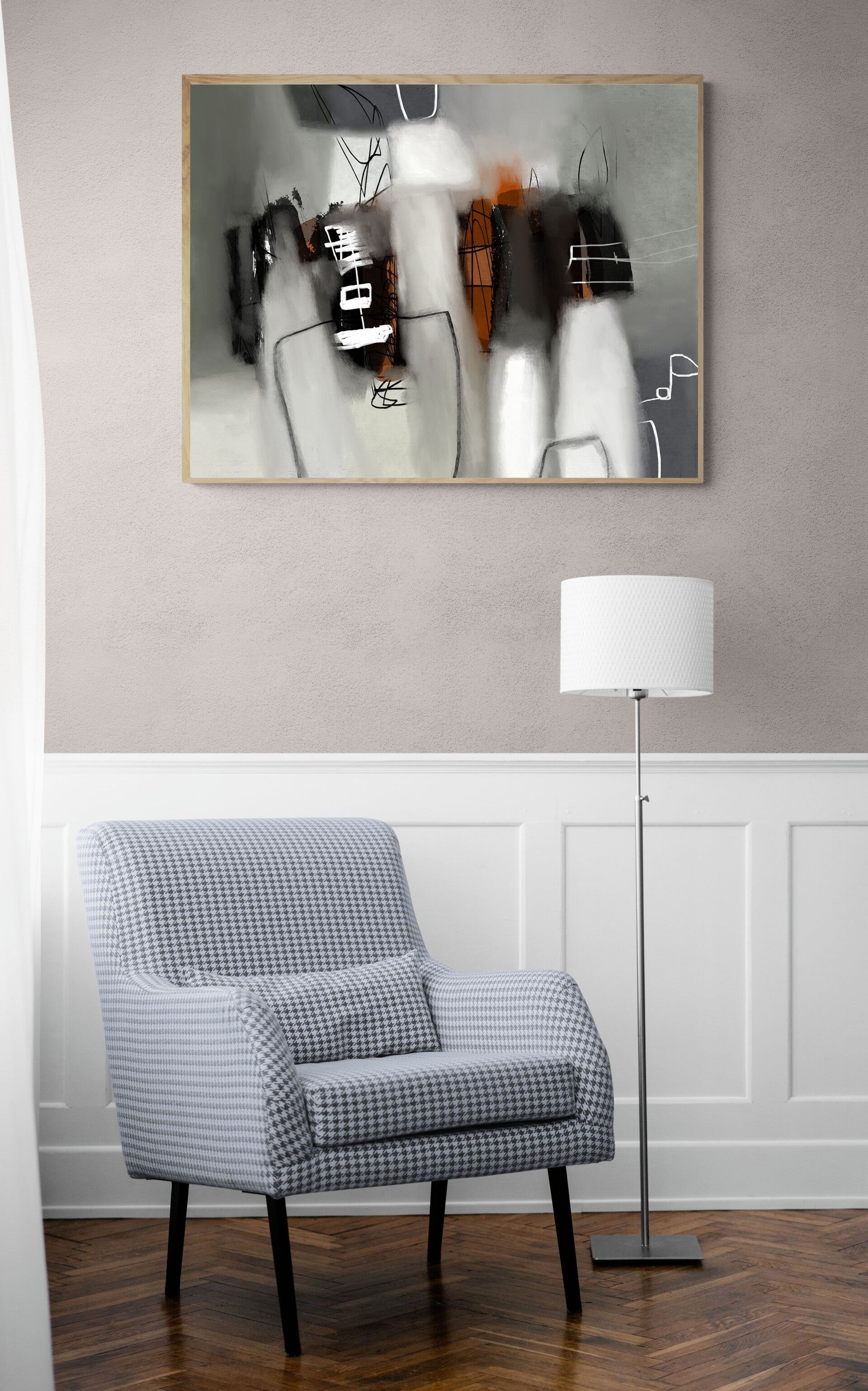 Modern abstract print with gray, beige and black tones and some contrasting orange brown