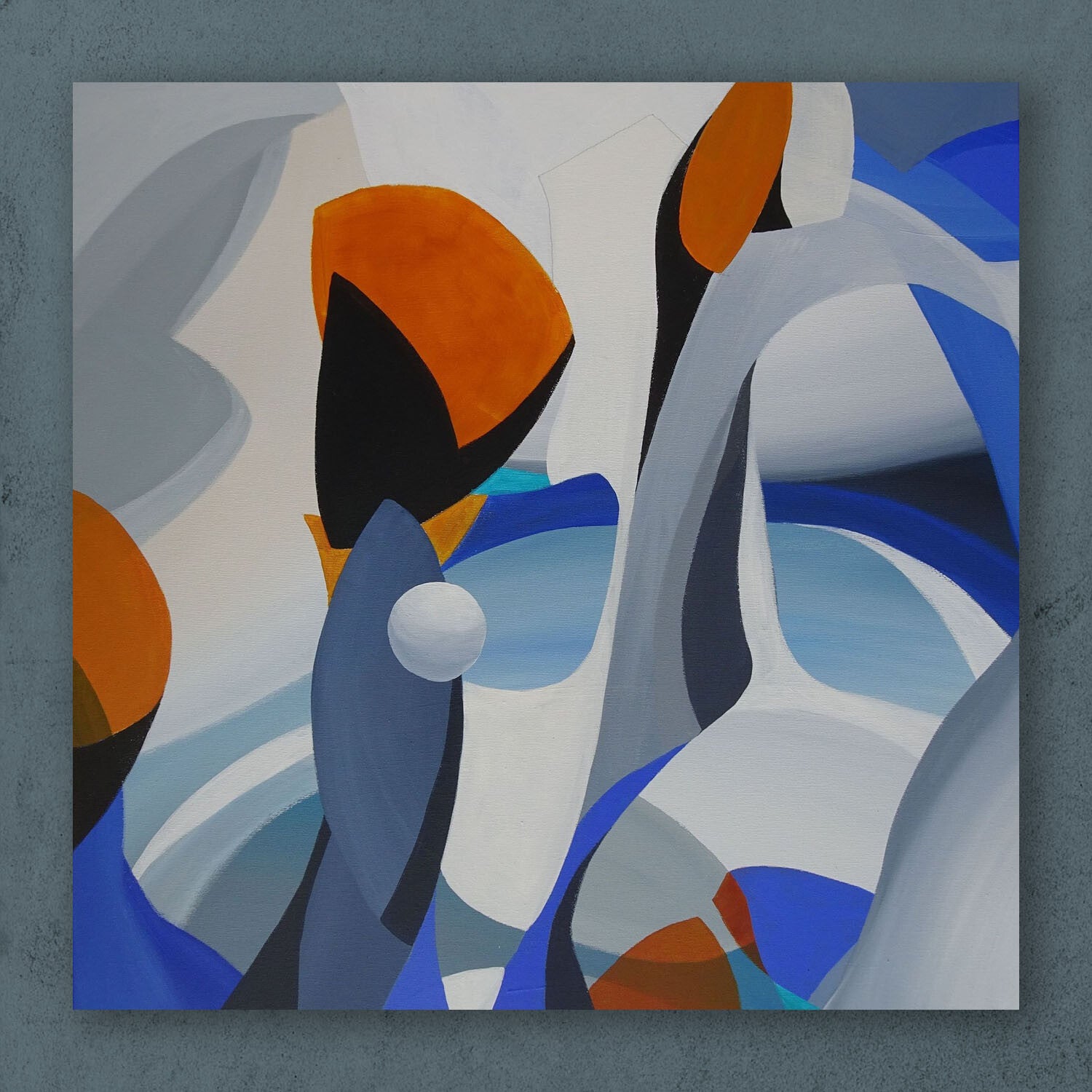 Modern mid century abstract geometric painting with vibrant colors and bold shapes. A composition of overlapping, geometric forms in shades of orange, gray, black, blue and white. The painting has a non-representational style. The overall atmosphere is energetic and modern, with a sense of dynamism and visual complexity.