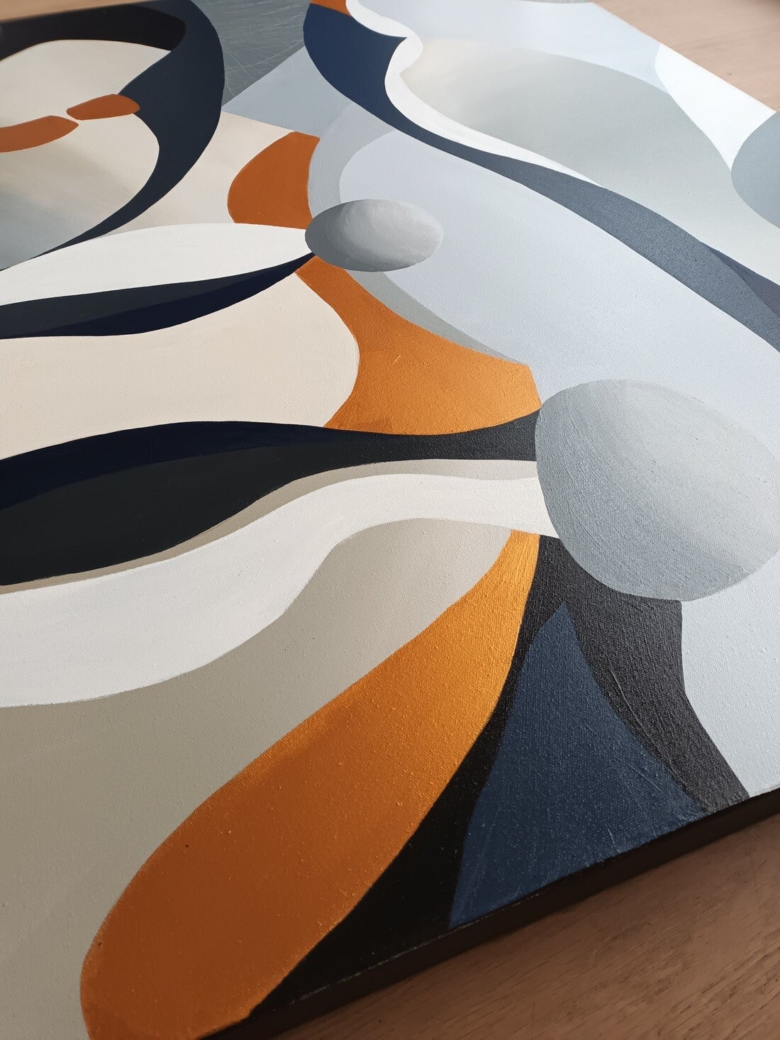 Abstract painting featuring a composition of organic shapes and forms in muted tones. Gray, beige, navy blue, and ochre colors create a landscape-like feel. The shapes are fluid and interconnected. The style is modern and minimalist, with a focus on line and shape and a calm and serene color pallette. Perspective is ambiguous, giving a non-representational quality.