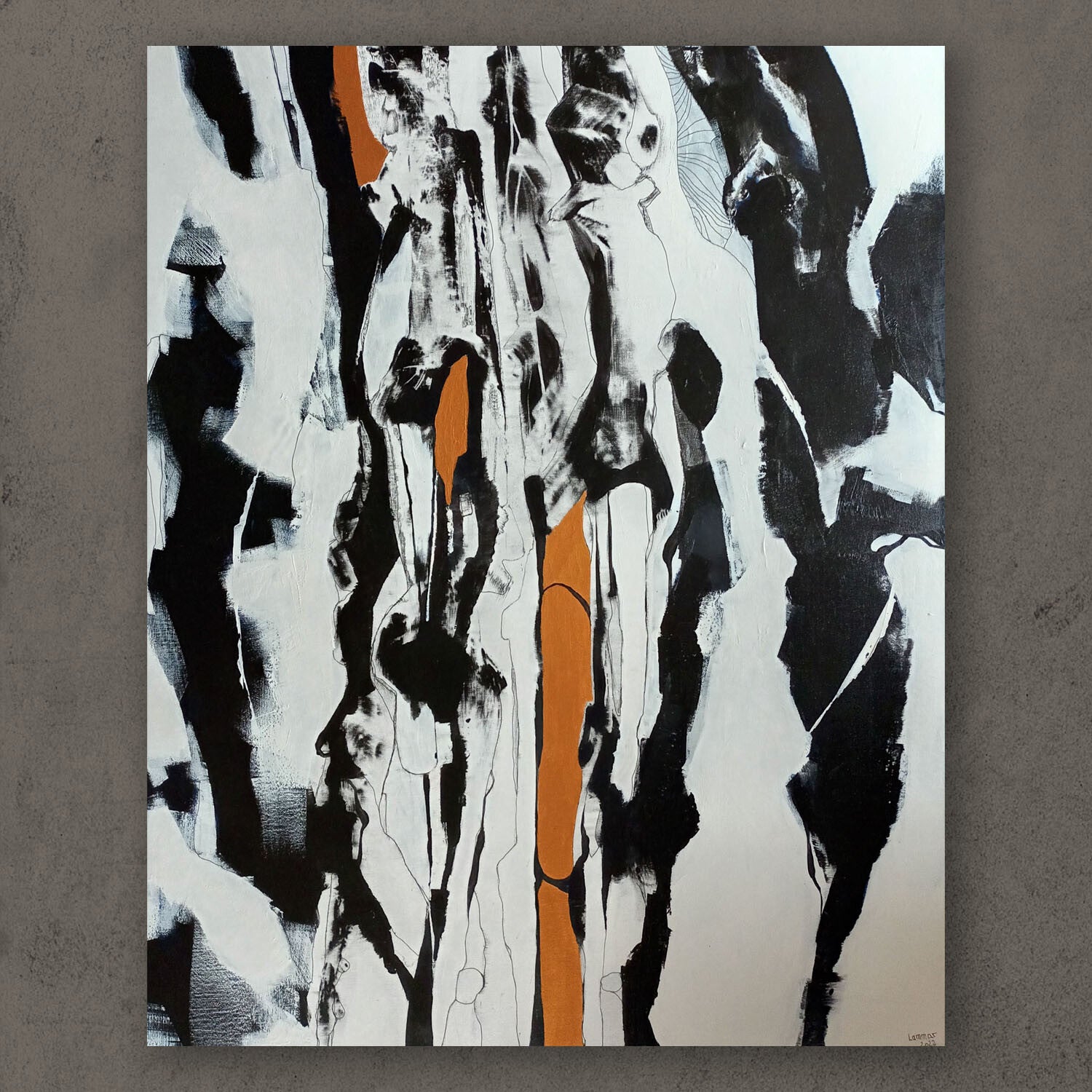 Abstract painting, predominantly black and white, with accents of burnt orange. The composition is characterized by layered, textured forms. Vertical elements are prominent. The forms are loosely defined, suggesting a gestural approach to painting. The burnt orange lines and shapes act as a central feature, drawing the eye through the piece. The style is abstract expressionist, with visible brushstrokes and paint application techniques. The colors are bold and contrasting, with the black and white dominating the canvas, creating a strong visual impact.