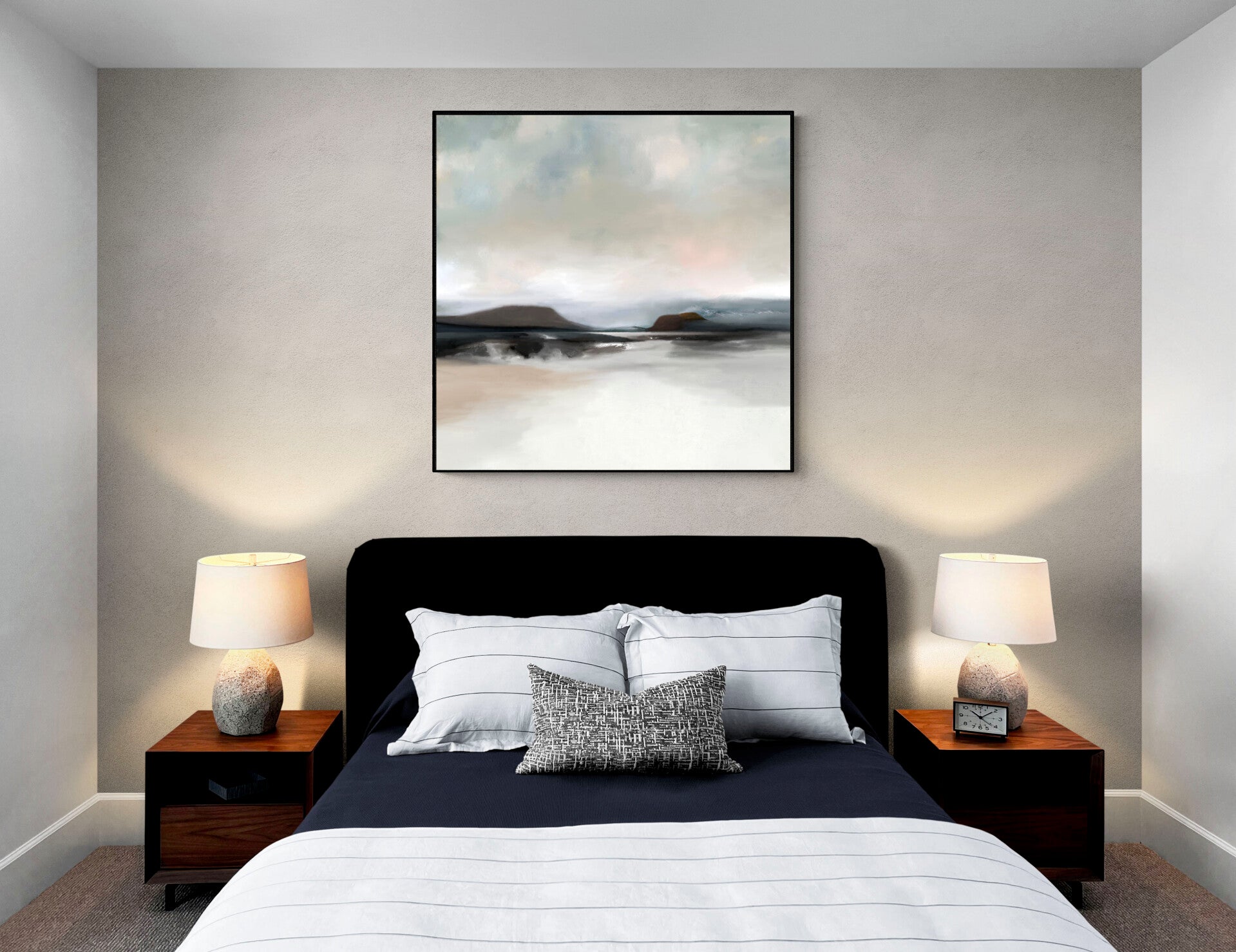 Landscape painting depicting a serene coastal scene with hills, a shoreline and a cloudy sky. A body of water stretches between the hills and the shoreline. The foreground shows a vast expanse of light beige and white, suggestive of sand or beach. The soft, blended brushstrokes create a painterly effect. Light appears diffused and gentle, not harsh, with no distinct highlights. The overall style is impressionistic and abstract, conveying a sense of quietude and contemplation.