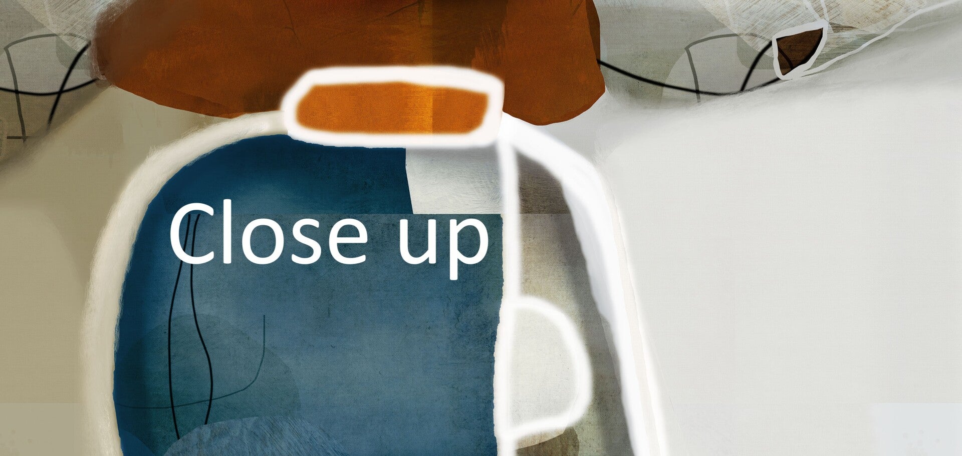 Abstract artwork featuring a stylized, outlined object positioned in the center of the image and in shades of blue and brown. The outline is white, with subtle variations in shading and texture. Surrounding the object are abstract shapes and forms in muted tones of beige, gray and muted blues and browns, creating a layered effect.